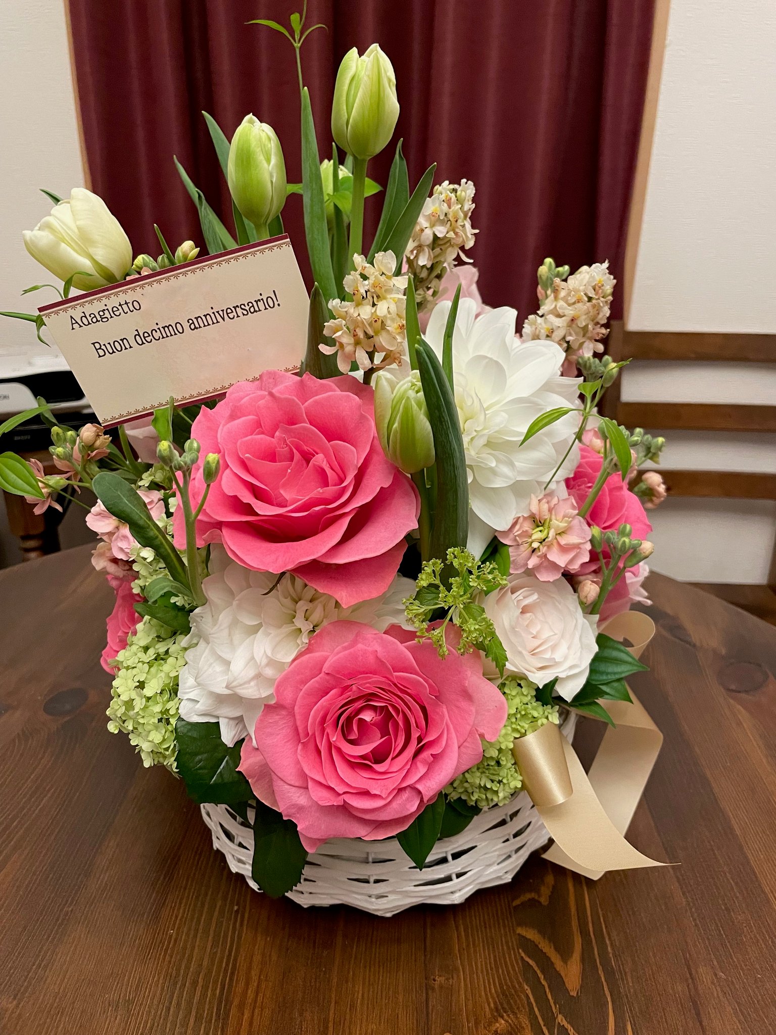 お祝いの美しいお花やお菓子を